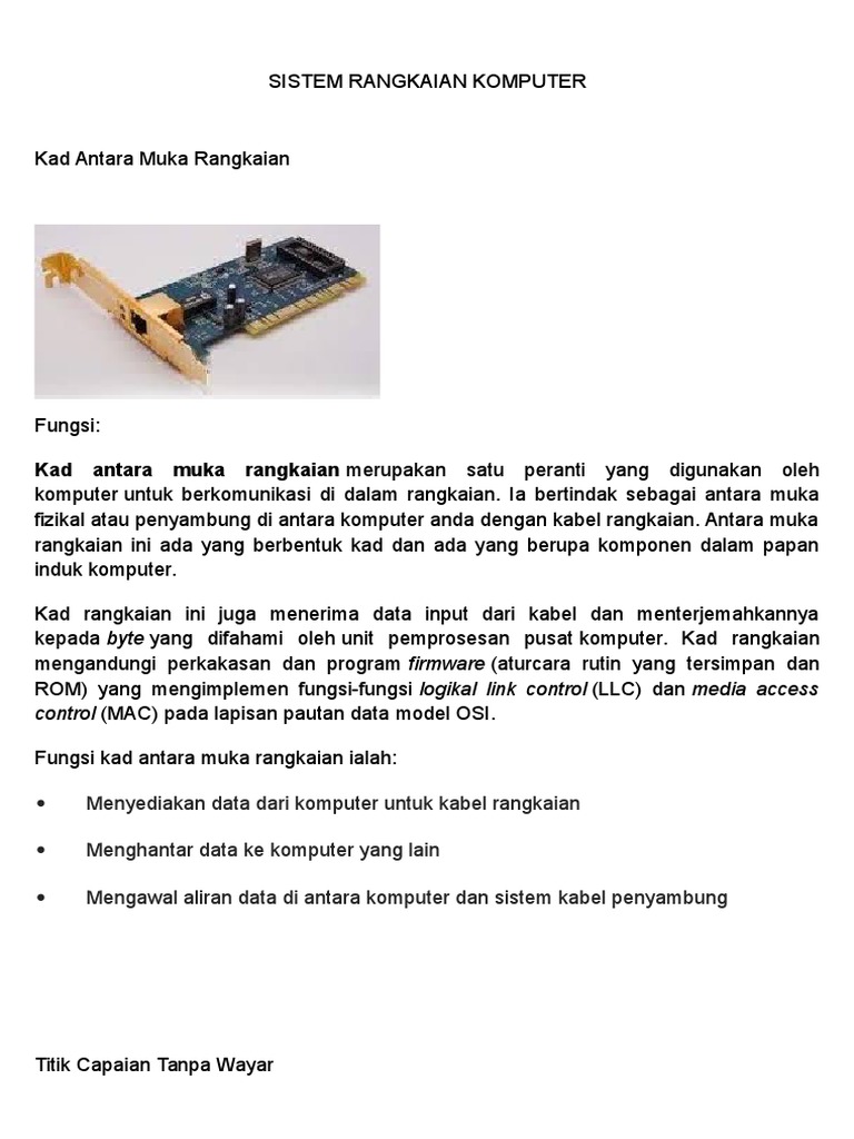 Menyimpan data suruhan dan maklumat untuk kegunaan masa depan. Network Interface Cards - Kad Antara Muka Rangkaian Network Interface Cards NIC merupakan penyambungan fizikal antara rangkaian dengan komputer stesen kerja. Ini merujuk kepada isyarat analog dan digital yang digunakan untuk mengodkan maklumat dalam isyarat.