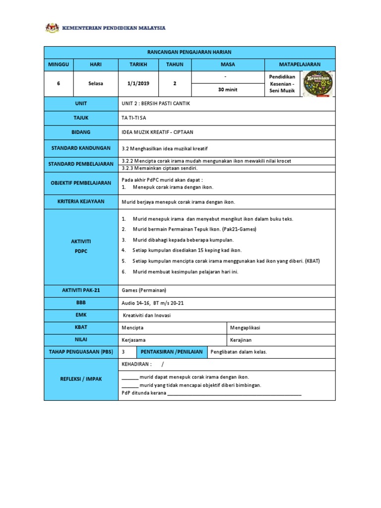 Pendidikan muzik tahun 2unit 2 bersih pasti cantikobjektif. Murid menghasilkan bunyi berdasarkan corak yang terdapat pada kad ikon tersebut. Pada akhir pembelajaran murid dapat menepuk corak irama dengan ikon.